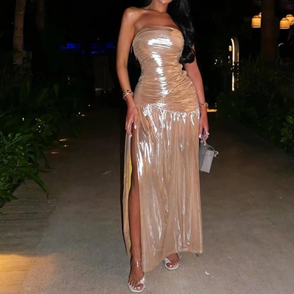 مزاجه قبالة الكتف بلا أكمام فستان مناسب أنيق الجوف خارج الطية فستان الحفلات مثير صديرية دائرية عالية سبليت مشرق مساء اللباس